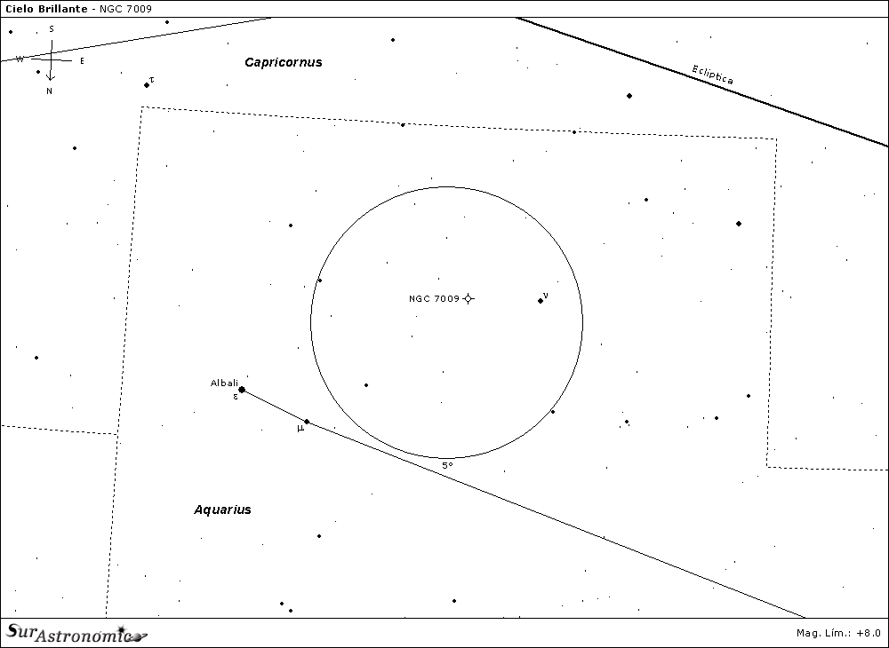 Observable desde la ciudad utilizando binoculares 10x50 y 15x70. Para localizarla se recomienda comenzar ubicando las estrellas epsilon (ε) Aquarii y mu (μ) Aquarii, dos estrellas de magnitudes 3.8 y 4.7, detectables a simple vista en noches medianamente oscuras desde la ciudad. Ambas estrellas se encuentran separadas por 1.3°. Moviéndonos desde mu Aqr hacia el sudeste unos 4.8° nos encontraremos con nu (ν) Aquarii, de magnitud 4.5. Notaremos que entre nu Aqr y mu Aqr se encuentra un triángulo apenas alargado que apunta hacia mu Aqr, con la base menor del triángulo orientada en sentido sudoeste-noreste. NGC 7009 se localiza entre la estrella del vértice sudoeste y nu Aqr, a medio camino entre ambas y apenas desplazada hacia el sudoeste. Identificaremos en esa pequeña zona un triángulo alargado que apunta hacia el sudeste. El vértice sudeste lo forma la nebulosa planetaria. Las dos estrellas restantes tienen magnitud 8.2 (SO) y 8.4 (en). Con binoculares la observaremos de aspecto muy estelar. Utilizando mayor aumento en un telescopio pequeño podremos resolver el disco de la nebulosa y notarlo algo alargado.