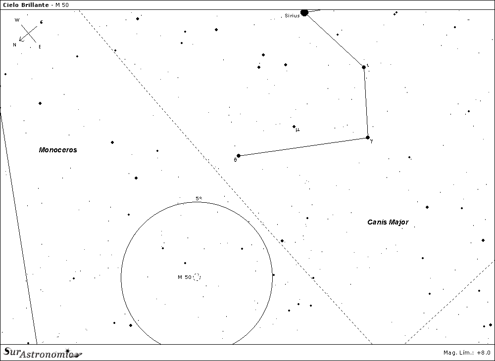 El cúmulo abierto M 50 (NGC 2323) se localiza en la constelación de Monoceros, a una distancia de 3200 años luz del Sol. Posee un tamaño real estimado en 20 años luz, con la parte más densa del cúmulo correspondiendo a unos 10 añños luz. La población total de estrellas se estima en las 200 componentes, con unas 100 entre magnitud 9 y 14. Posiblemente haya sido descubierto por Giovanni Domenico Cassini en 1711, y luego reportado de forma independiente por Charles Messier en 1772.