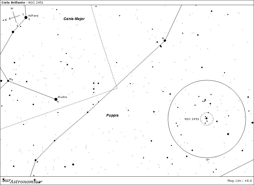 El cúmulo abierto NGC 2451 se localiza a una distancia de unos 850 años luz del Sol, hacia la constelación de Puppis. Fue descubierto por Giovanni Batista Hodierna en 1654. Posee unos 40' de diámetro y unas 40 estrellas componentes.