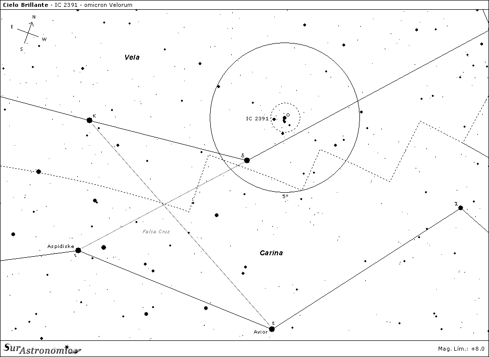 Para encontrarlo, podremos valernos de la Falsa Cruz, extendiendo hacia el noroeste su eje menor formado por iota Carinae y delta Velorum. El cúmulo aparecerá destacado en el campo visual de nuestros binoculares.
