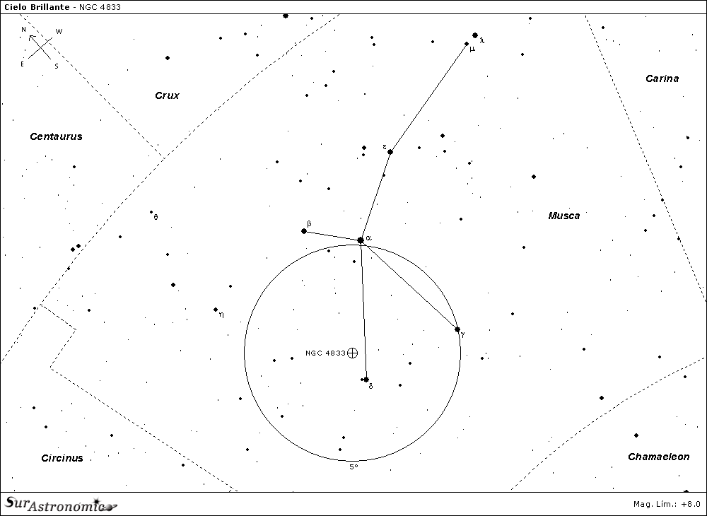 El cúmulo globular NGC 4833 (Dunlop 164, Bennett 56) fue descubierto por Abbe Lacaille desde Sudáfrica en 1751 utilizando un telescopio de ½ pulgada. Se trata de un cúmulo clase VIII localizado a unos 21000 años luz del Sol, y posee un diámetro real de unos 42 años luz. Se lo puede encontrar a 42' al nornoreste de la estrella delta (δ) Muscae (gigante roja de magnitud 3.6, visible a simple vista) Entre sus estrellas componentes se han encontrado varias gigantes rojas y muchas variables.