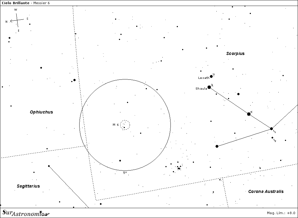 El cúmulo abierto Messier 6 (NGC 6405, Butterfly Cluster) era conocido desde tiempos pre-telescópicos. El primer avistamiento se le atribuye a Giovanni Batista Hodierna cerca del 1654. Descubrimientos independientes luego fueron realizados por de Chéseaux alrededor de 1745 y Louis de Lacaille en 1752. Messier tenía conocimiento de las observaciones de Lacaille, y en mayo de 1764 observó el cúmulo y escribió: "a ojo desnudo el cúmulo parece ser una nebulosa; pero con el instrumento más pequeño empleado para examinarlo, uno ve un cúmulo de pequeñas estrellas, 15' de diámetro". Se encuentra a una distancia de unos 1590 años luz, y posee un diámetro real de 10 años luz.