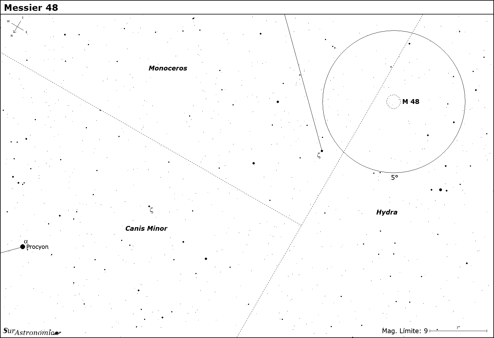 Para ubicarlo, un buen punto de partida es la estrella Procyon (alpha Canis Minoris), de la cual el cúmulo se encuentra a 14° en dirección sudeste. Siguiendo la línea desde Procyon aparecerá en el campo la estrella zeta (ζ) Monocerotis (magnitud 4.4) 3° antes de M 48. En dirección este-noreste y a 3.5° del objeto encontraremos un notable trío de estrellas brillantes que también darán un punto de referencia útil.