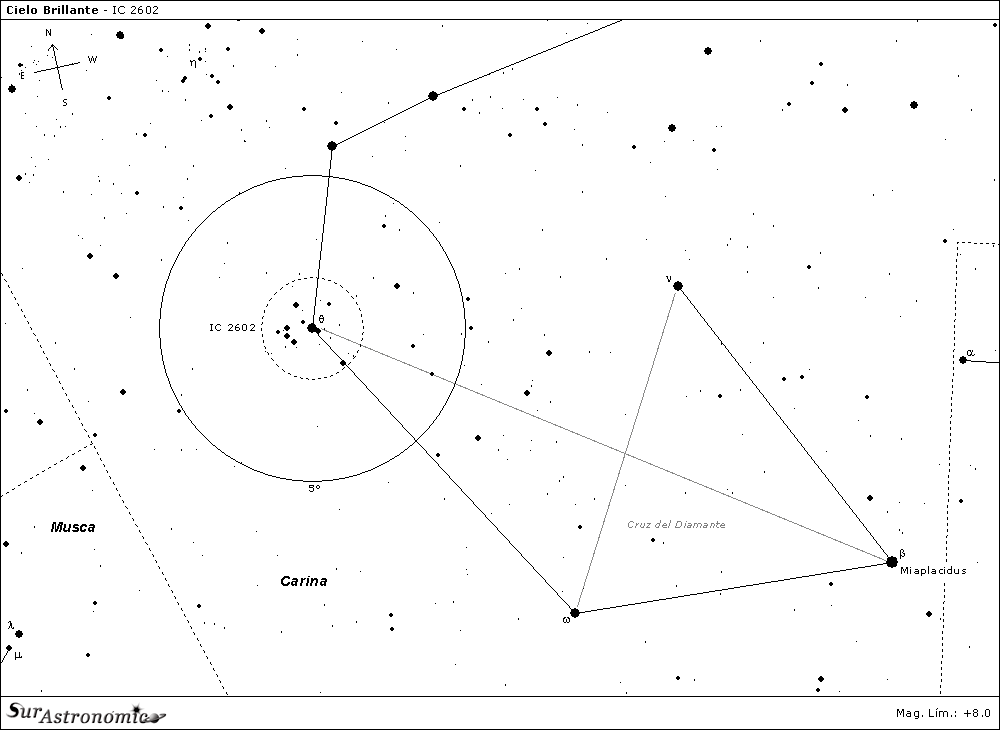 El cúmulo abierto IC 2602 (cúmulo de theta Carinae, Cr 229, Mel 102) fue descubierto por Abbe Lacaille el 3 de Marzo de 1752 desde Sudáfrica, quien lo comparó con el cúmulo de las Pléyades (M 45), en la constelación boreal de Taurus, y de ahí que también se lo conozca como las "Pléyades Australes". Datos del satélite Hipparcos lo sitúan a una distancia de 479 años luz del Sol. Su edad estimada es de 50 millones de años y posee unas 60 estrellas componentes, entre las que se destaca theta (θ) Carinae, una estrella azul (índice de color B-V=-0.22) de magnitud +2.7.