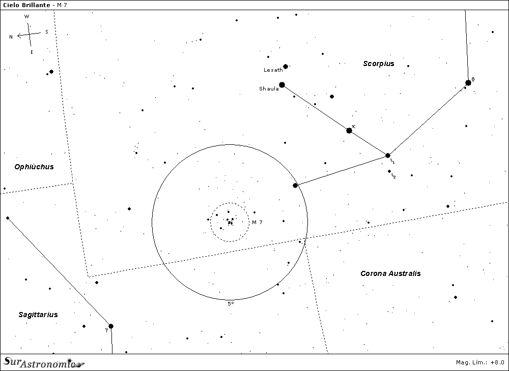 M 7 (NGC 6475 o Ptolemy's Cluster) es uno de los cúmulos abiertos más reconocidos del cielo. Se localiza a unos 950 años luz de distancia hacia la constelación de Scorpius, cercano al límite con Sagittarius, y a unos 4.7° de la estrella Shaula, lambda (λ) Scorpii, visible a simple vista. Para encontrarlo, debemos reconocer a Scorpius, y seguir su forma curva hasta la cola. Allí veremos al oeste dos pares de estrellas brillantes, Lesath y Shaula, separadas por 36', y 3.2° hacia el este otra algo menos brillante, de tono rojizo (SAO 209318, índice de color B-V de +1.17). Debemos continuar la curva de la figura por el camino que marca esta estrella solitaria, y unos 2.5° el norte de esta encontraremos a M 7.