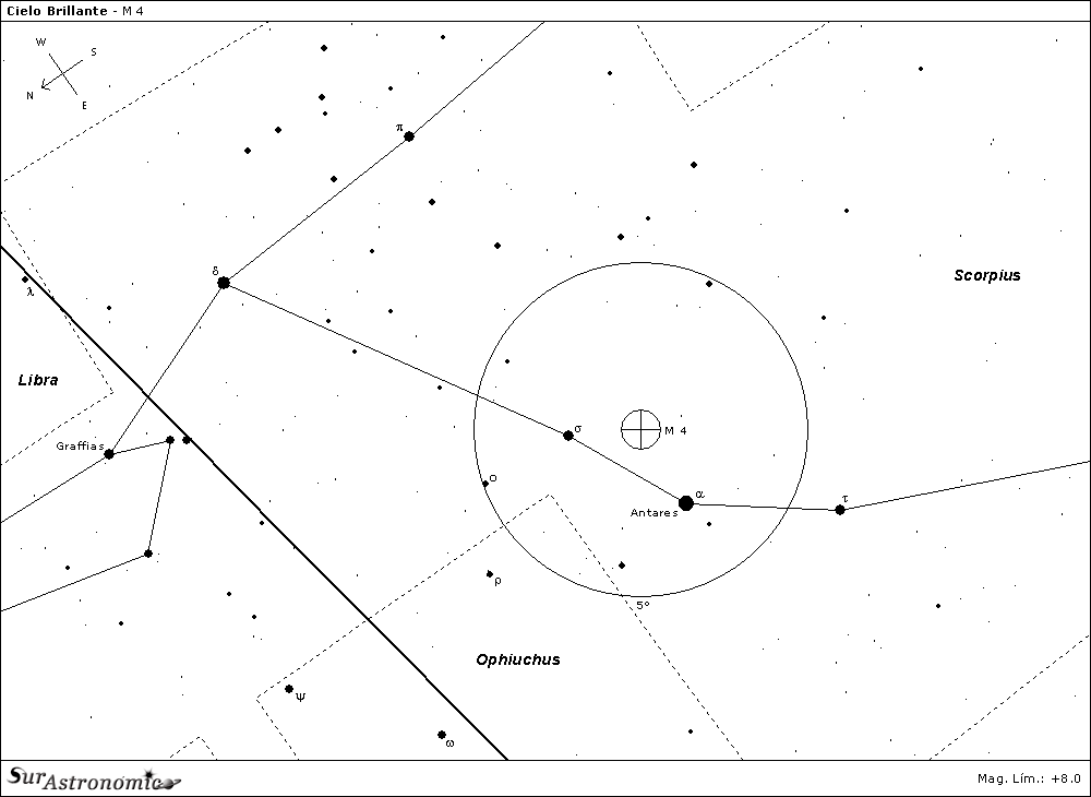 M 4 (NGC 6121) es un cúmulo globular clase IX localizado en Scorpius, a 1.3° al oeste de Antares, alpha (α) Scorpii. Se encuentra a una distancia de 5640 años luz, lo que lo convierte en unos de los más cercanos al Sol. Fue descubierto por Phillipe Loys de Chéseaux en 1746 y luego catalogado por Charles Messier en 1764. Este fue el primer cúmulo globular cuyas estrellas fueron resueltas. Se han encontrado al menos 43 estrellas variables en M 4. En 1987 se descubrió un púlsar con un período de 3.0 milisegundos, y fotografías del Telescopio Espacial Hubble en 1995 permitieron descubrir estrellas enanas blancas que se encuentran entre las estrellas más antiguas que se conocen, con 13000 millones de años de edad.