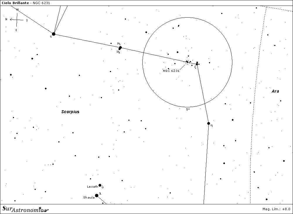 NGC 6231 (Dunlop 520, Collinder 315, Table of Scorpius) es un pequeño cúmulo abierto localizado cerca del vértice donde la cola del escorpión se dobla hacia el este. Se localiza a unos 5900 años luz del sol. Este objeto tuvo varios descubrimientos independientes: se tiene referencias de Giovanni Batista Hodierna quien lo publicó en su catálogo de 1664, pero el cual estuvo perdido hasta principios de 1980. Fue independientemente redescubierto por Edmond Halley en 1678, por Philipe Loys De Cheseaux en 1745-46 y por Abbe Lacaille en 1751-52. Se trata de un cúmulo joven, de solo 3.2 millones de años de edad. La estrella más caliente del cúmulo es tipo de espectral O8 y se cree que pertenece a la asociación Scopius OB de estrellas muy jóvenes.