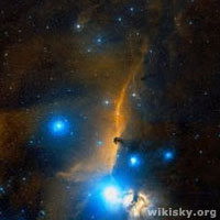Siguiendo nuestro periplo, volvemos hasta Alnitak y, desde ella, vamos a NGC 2024, la Nebulosa Flama. Esta hermosa nebulosa de emisión-reflexión, descubierta por el gran William Herschel en el año 1786, se localiza inmediatamente al este, centrada a unos 15’ de arco, de Alnitak y por ello, la nebulosa, también es conocida como El fantasma de Alnitak. Su mag. es 10,7, tamaño angular 35’x30’, presentándose ancha, con orientación este-noreste a oeste-sudoeste, A. P. 80º. Con un diámetro de 12 años luz y a una distancia de 800 años luz, forma parte del gigantesco complejo molecular de Orion, siendo una espectacular región H II donde está aconteciendo un gran nacimiento estelar. En su interior habita un joven cúmulo estelar de un centenar de miembros, con edades menores a 1 millón de años, además de muchas protoestrellas en formación; este cercano cúmulo está bastante oculto en el interior de la extensa y densa banda oscura, superpuesta por el centro a la zona de emisión, desplazándose principalmente de sur a norte.