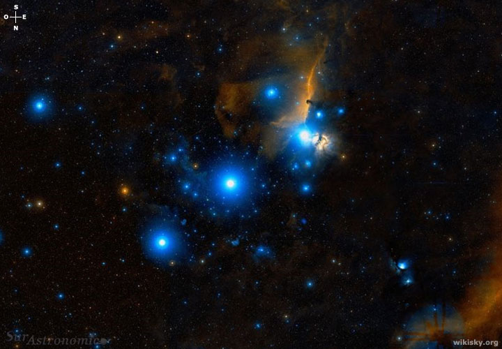 Emprenderemos el recorrido por la zona aledaña a la estrella Alnitak, abordando al Cúmulo de sigma (σ) Orionis. Con una joven edad, estimada en menos de 5 millones de años, este lozano cúmulo abierto o galáctico, forma parte de la interesante Asociación Orion OB 1 B. Se ubica a 50’ al sudoeste de la destacada estrella y, a 36’ al oeste-sudoeste de la nebulosa oscura B 33. Posee un diámetro de 10’ de arco, clasificación es III 3 p n; siendo un magnífico objeto de estudio para entender los procesos de formación y evolución estelar.
