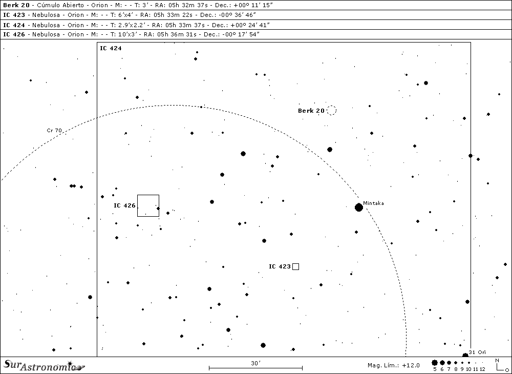 Nuestro anteúltimo objetivo, IC 426, se halla a 55’ al norte de Alnilam y a 1,1º al este de Mintaka, formando un triangulo con ellas. Es una nube de gas y polvo cósmico, muy irregular, que refleja la luz de estrellas cercanas, tiene dimensiones 10’x3’, apareciendo en fotografías con tonos azulados y grisáceos. Conociendo su ubicación, puede detectarse vagamente con prismáticos de 15x70 sobre un rico campo estelar, desde un lugar oscuro y, surgirá con bajo brillo en un reflector de 8", sobre un área con cierta absorción hacia el noroeste. Con esa apertura, pocos aumentos y, bajo un cielo oscuro, la veremos oval-redondeada, con bordes indefinidos, que se integran con el rico fondo estelar. De bajo brillo superficial, como una muy vaga neblina grisácea, destacándose más brillante hacia el sur. Sobre ella y alrededores encontramos varias estrellas entre la 8ª y la 13ª mag., la más destacada es HD 37140, blanco-azulada y de mag. 8,6, sobre el borde oeste.