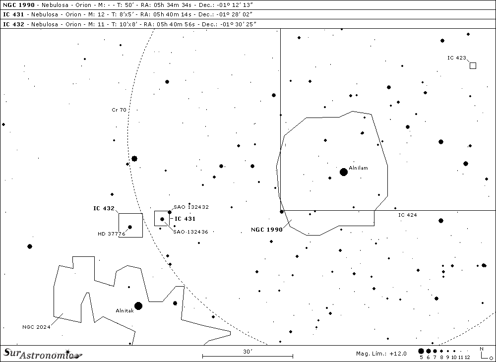Nuevamente regresamos hasta Alnitak y, a unos 25’ de arco al norte de ella, encontramos otras dos nebulosas de reflexión, denominadas IC 431 e IC 432. La más destacada es IC 432, con mag. 11, tamaño 10’x8’ y diámetro real de 3 años luz; mientras que IC 431, tiene mag. 12, dimensión aparente 8’x5’y diámetro de 2 años luz.