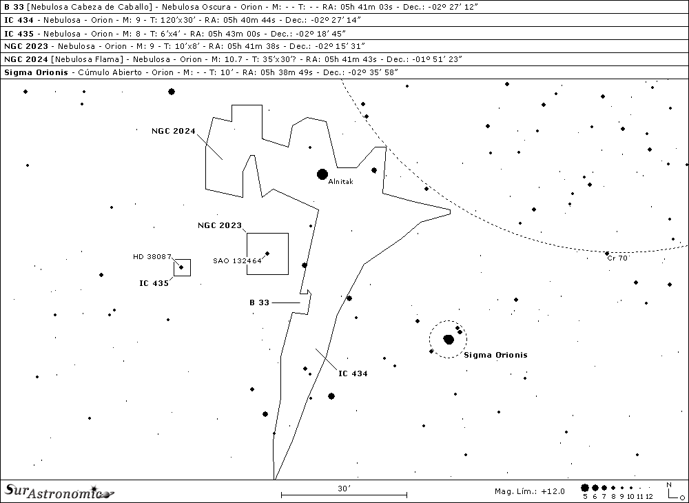 A continuación comenzaremos con nuestros primeros desafíos, moviéndonos unos 30’ al este-noreste o a unos 22’ prácticamente al sur de Alnitak, donde nos situaremos en el centro de la interesante zona nebular que comprende a NGC 2023, IC 434 y B33, tres diferentes nebulosidades del mismo complejo; la primera es de reflexión, la segunda de emisión y la tercera, la nebulosa oscura Cabeza de Caballo.