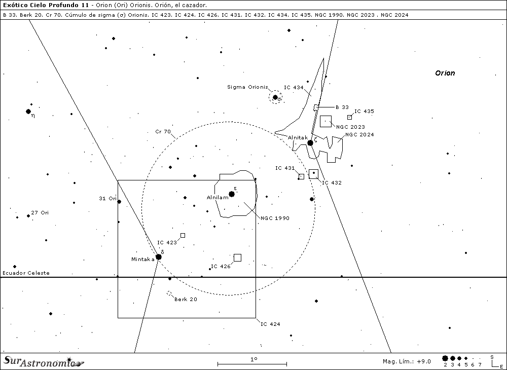En esta interesante zona, parte de la asociación Orion OB 1B, apenas al sur del ecuador galáctico e ideal para ser observada desde ambos hemisferios, planeamos el breve recorrido de esta entrega, estudiando variadas nebulosidades y agrupaciones estelares, algunos de estos objetos serán elusivos y otros notables. Parte de los primeros, son las nebulosidades tratadas aquí, pertenecientes al primer Index Catalogue o IC, catálogo confeccionado en 1895 por el astrónomo de origen danés J. L. E. Dreyer; desde este catálogo se arrastra el error que adjudica el descubrimiento de IC 423, 424, 426, 431, 432 y 435, al gran astrónomo norteamericano E. C. Pickering, cuando en realidad todos estos objetos fueron descubiertos, detectándolos en placas fotográficas, por la gran astrónoma de origen escocés Williamina P. S. Fleming. Ella, y de igual forma, fue también quien detectó por primera vez a la nebulosa oscura B 33.