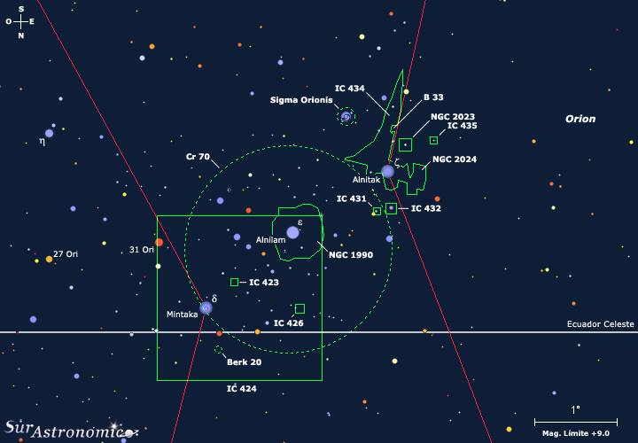 Partiendo desde la nebulosa NGC 2024, encontramos NGC 2023 a 25’ al sur y, la estrella Alnitak, superpuesta a la zona, se ubica a 23’ al nornoroeste.