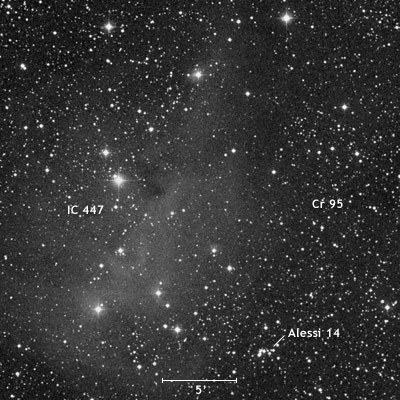 Ahora salimos de esta atractiva área, trasladándonos medio grado al sudoeste, para caer justo sobre el ecuador galáctico, en otro llamativo campo estelar, interesante con prismáticos ó buscador. En él hallamos tres objetos superpuestos, nada fáciles de observar: IC 447, una ligera nebulosa de reflexión descubierta en 1884, por Edward Emerson Barnard y, dos agrupaciones abiertas, Cr 95 y Alessi 14.
