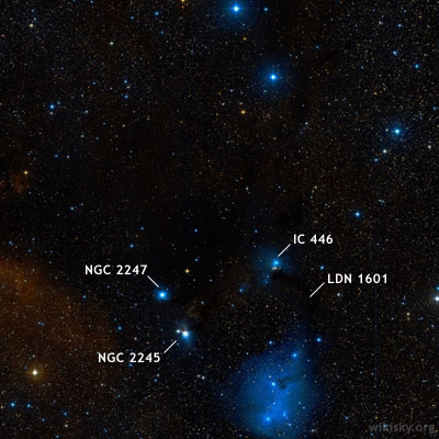 A unos 12’ al sudsudoeste de NGC 2247 y 30’ al este-sudeste de IC 446, nos toparemos con NGC 2245, otra tenue nebulosa de reflexión de 2’ en diámetro. Esta vez, debemos su descubrimiento al gran William Herschel, quién la halló en el año 1784. Posee mag. fot. 11, un diámetro real de 12 años luz y, se encontraría a una discutida distancia de más de 7000 años luz.