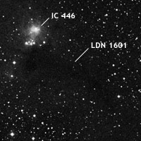 Sobre el borde sudoeste, la nebulosa se oscurece abruptamente para formar la zona de absorción, clase 5, LDN 1601, de 8’x11’ de arco.