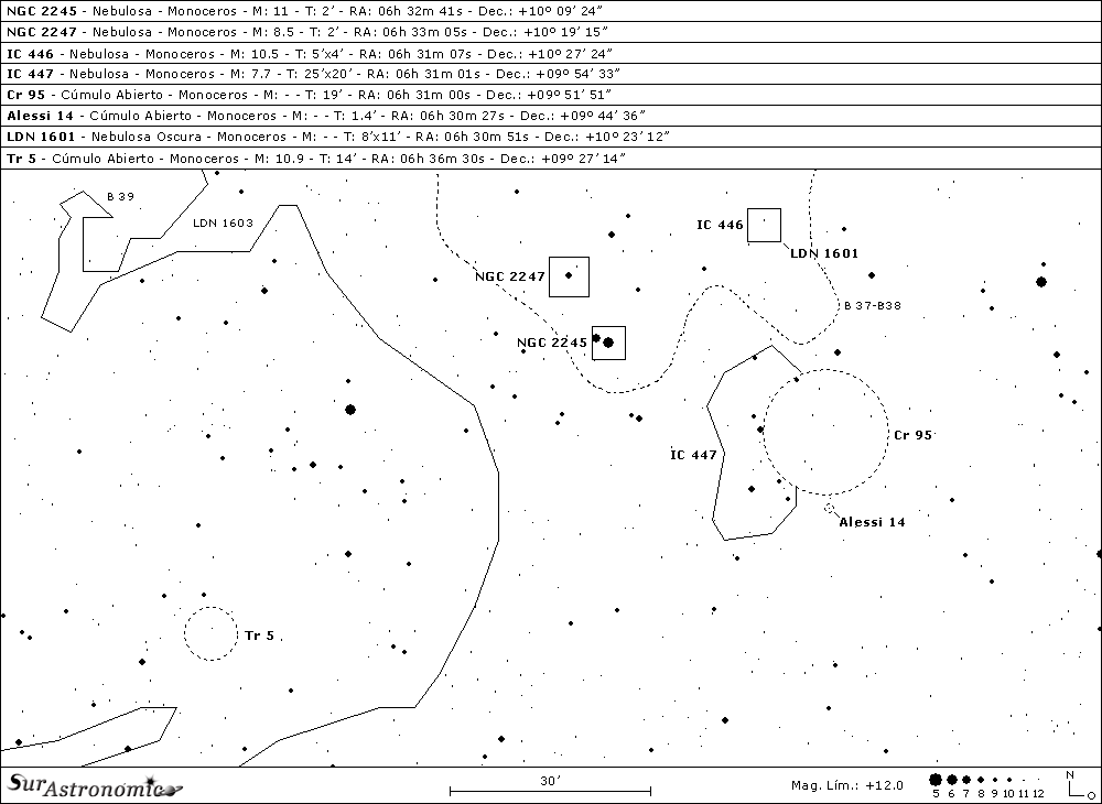Centrándonos a 1,5º al oeste-sudoeste de este cúmulo, nos encontraremos inmersos en una interesante zona nebular donde, se han identificado tres pequeñas nebulosa de reflexión que pueden aparecer en el misma área de un ocular de baja potencia y/o gran campo, sumergidas en la notoria área de absorción Barnard 37/38. Aquí estudiaremos los siguientes objetos: B 37, B 38, IC 446, LDN 1601, NGC 2245 y NGC 2247.