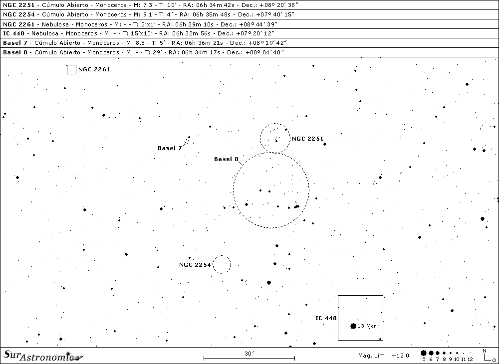 Seguimos nuestro periplo, moviéndonos 25’ al oeste, para hallar NGC 2251. Nuevamente descubierto por el astrónomo alemán William Herschel, en el año 1783, este cúmulo galáctico, clase III 2 m, se encuentra a una distancia de 4300 años luz. Con mag. 7,3 y diámetro 10’, lo componen unas cincuenta estrellas a partir de la 9ª magnitud. Se encuentra pegado, en una pequeña parte superpuesto, al norte y apenas al este, del centro de Basel 8 y, a unos 2º al sudoeste de NGC 2264.