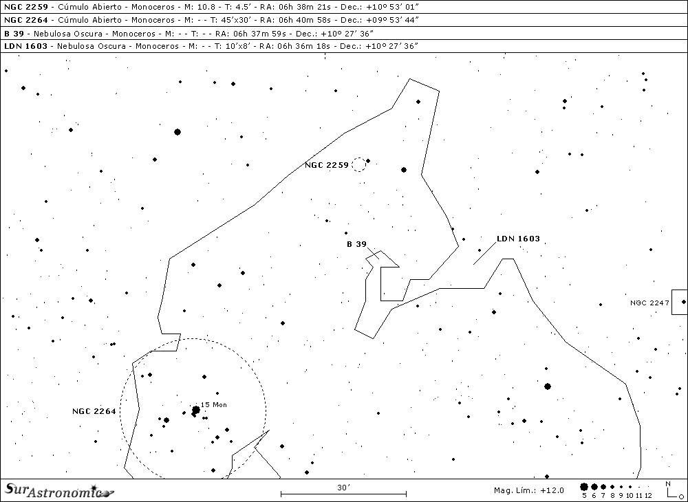 Lo ubicamos a 1º al oeste-sudoeste de NGC 2264, al cual volvemos para ir en busca de nuestros próximos objetivos, B 39 y LDN 1603.