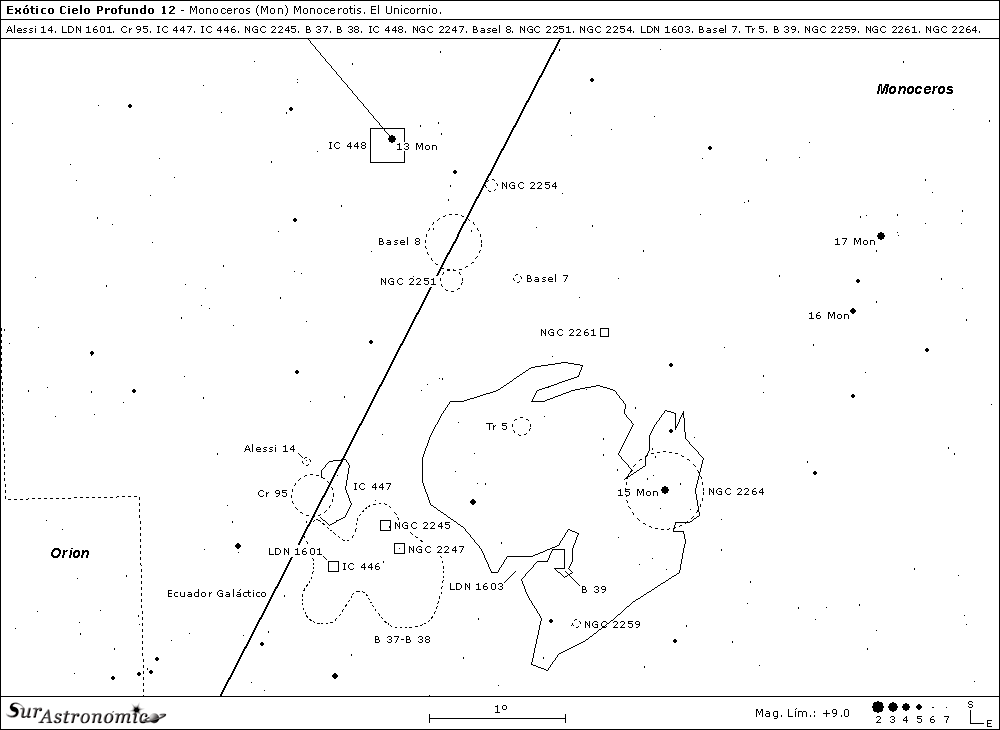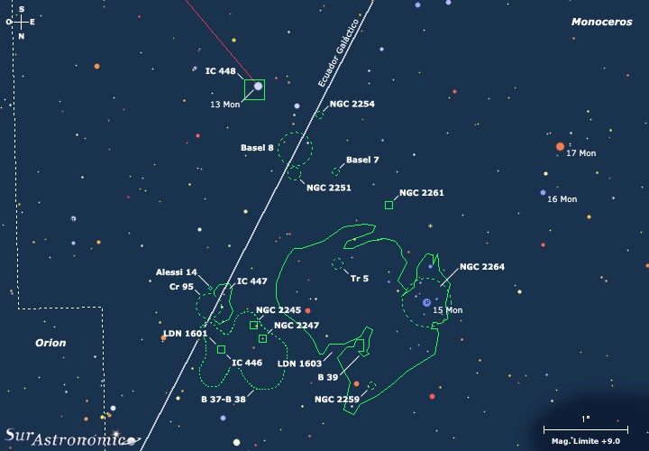 Por el noroeste de Monoceros, limitando con las constelaciones de Gemini y Orion, esta área seleccionada abarca unos 9º cuadrados e, incluye varias nebulosidades brillantes y oscuras, y también cúmulos galácticos. En total, indagaremos veinte objetos de cielo profundo de variada dificultad que, como siempre, recomendamos observar desde lugares oscuros, fuera de las luminosas ciudades.