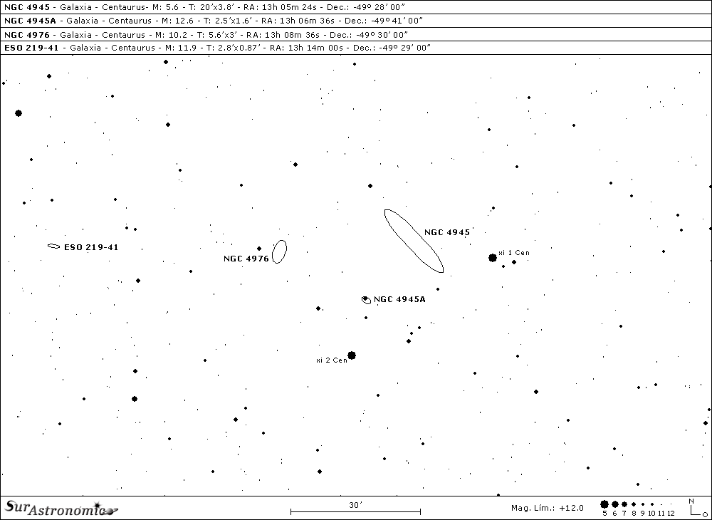 A unos 30’ al este de NGC 4945, encontramos a la galaxia elíptica, clase E4p, descubierta en el año 1835 por J. Herschel, NGC 4976. De magnitud 10,2, mag. fot. 11, brillo superficial 13,2 y tamaño angular de 5,6’x3’. Ángulo de posición 161º, hallándose a casi 55 millones de años luz de nosotros. Telescópicamente puede detectarse con un refractor de 3" y, con un reflector de 10" se aprecia muy rodeada de estrellas, al este la más destacada SAO 223931 ó HD 114102, blanco-amarillenta, de mag. 7,8, a 4,5’ del centro. De forma oval, extendida casi 2:1 de nornoroeste a sudsudeste, como de 2’x1,3’, concentrada, subiendo suavemente en brillo hacia su pequeño y luminoso centro, con un sospechado núcleo estelar. Casi sobre el borde Este-Noreste, a menos de 2’ del centro, encontramos una estrella de 10ª/11ª mag.