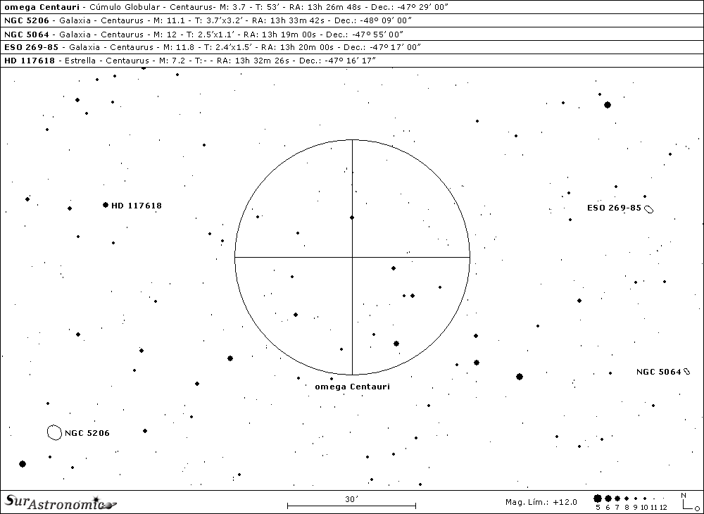 Para dirigirnos hasta el quinto objetivo de la noche, NGC 5206, primero volveremos a omega Centauri y, desde él, nos desplazamos 1,3º al sudeste hasta esta galaxia elíptica enana, perteneciente al grupo de NGC 5128. Tiene una discutida clasificación morfológica, siendo la más aceptada dEn’s, y se halla sobre un poblado campo estelar. Su magnitud es 11,1, mag. fot. 12 y su brillo sup. 13,3. Tiene dimensiones angulares de 3,7’x3,2’, ángulo de posición 16º, se encuentra a una distancia de 14 millones de años luz y, fue descubierta por el astrónomo y químico inglés John Herschel, a principios del mes de julio del año 1834.