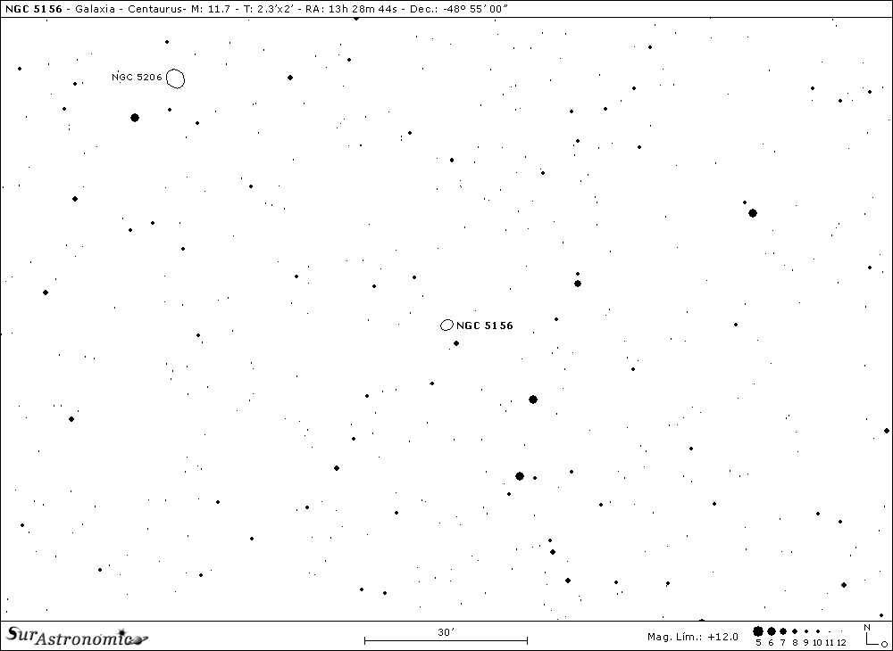Siguiendo con objetos difíciles, más desde una ciudad, nos vamos a NGC 5156. Ubicada a 1,5º al sudsudeste del fantástico cúmulo globular omega Centauri, o a 1,1º al sudoeste de NGC 5206, esta galaxia espiral barrada de estructura anular interna y brazos algo abiertos, con clasificación Hubble-de Vaucouleurs SB(rs)bc, fue descubierta, a fines del mes de marzo del año 1835, por J. Herschel. Tiene un tamaño aparente de 2,3’x2’, magnitud de 11,7, mag. fotográfica 12,5 y brillo superficial 14,2. Se hallaría a unos 120 millones de años luz del Sol y se nos presenta visualmente perpendicular, o sea como vista desde arriba.