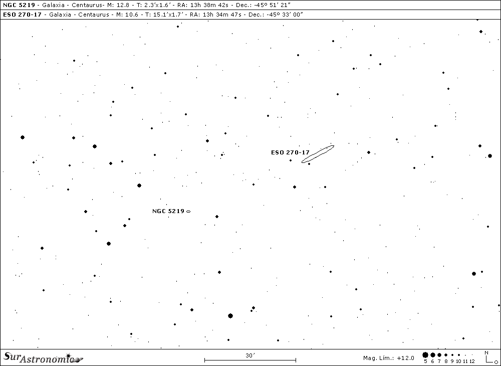 Nuestro cuarto objetivo es la galaxia NGC 5219 ó NGC 5244, el primer gran desafío. Hallada a cien millones de años luz de la Tierra, se trata de una galaxia espiral pequeña y tenue, con fuertes regiones H II. Tiene mag. 12,8, mag. fot. 13,4 y brillo superficial 13,9. Su dimensión angular es 2,3’x1,6’, se nos presenta con un A. P. de 12º y, según la clasificación de Hubble es tipo Sc. La ubicamos a unos 46’ al este-sudeste de la galaxia ESO 270-17, sobre un campo poblado de estrellas con brillo moderado y, justo a mitad de camino, se encuentra la estrella blanco-azulada, de mag. 9,7, GSC 08261-00491, la cual nos señalará el camino.