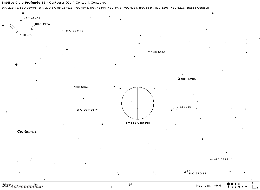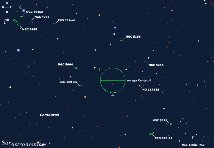 Siguiendo el itinerario, volvemos por última vez a omega Cen, para ayudarnos a localizar a NGC 5064 y ESO 269-85, dos galaxias espirales que llegan a entrar, compartiendo la misma área visual con otras tenues galaxias, en un ocular de gran campo y poco aumento, centradas a aproximadamente 1º al este de la periferia del hermoso omega Cen., sobre un bonito y rico campo estelar.