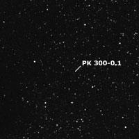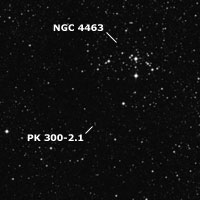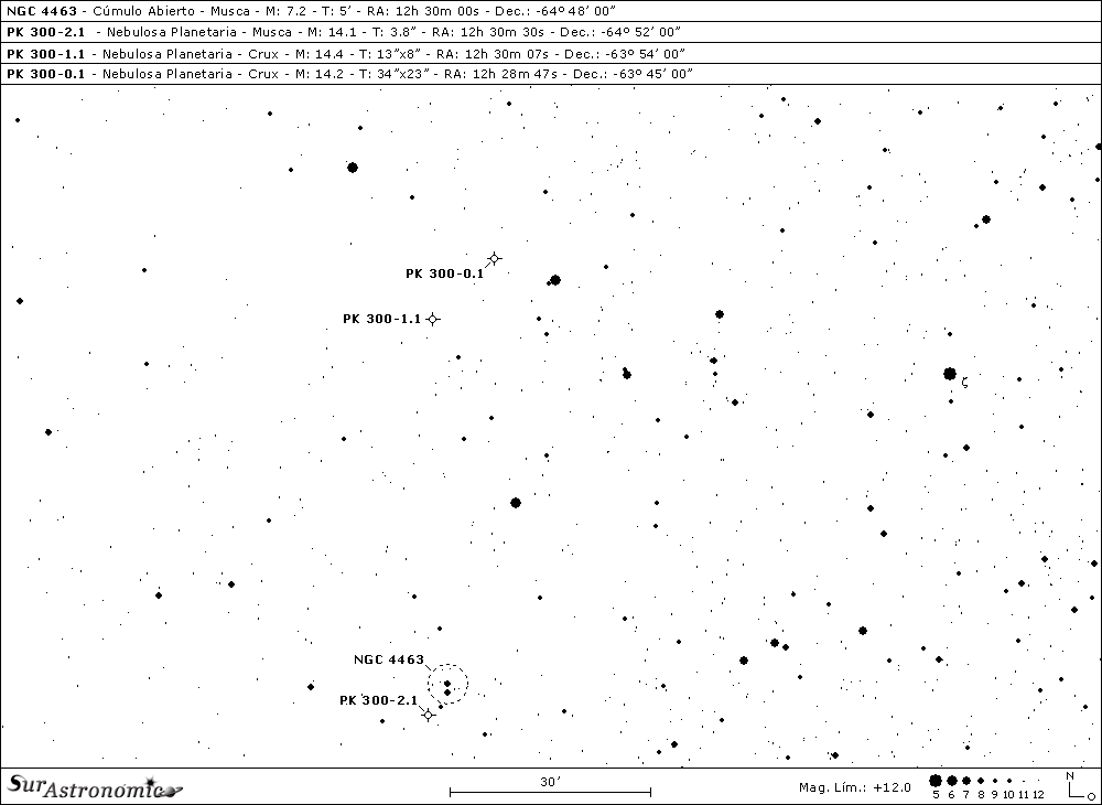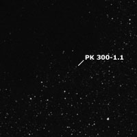 Para el final, dejamos dos desafiantes nebulosas planetarias, sobre otra zona de significativa absorción y, para aperturas mayores de 12". Para hallarlas, primero nos posicionaremos en la brillante alfa (α) Crucis, Acrux y, desde allí las buscaremos. La primera es PK 300-0.1, también denominada He 2-84, una débil nebulosa perteneciente al catálogo de los astrónomos checoslovacos L. Perek y L Kohoutek (PK) y, descubierta por K. G. Henize a principios de la década de 1960. Puede observarse, con dificultad, con aperturas de 11" y 280x, bajo un cielo oscuro y diáfano, como una muy pequeña y vaga luminiscencia, concentrada y algo más brillante hacia el centro, mejorando un poco al utilizar un filtro OIII. Tiene magnitud 14,2 y unas dimensiones aparentes de 34"x23". Está ubicada a unos 40’ de arco al sudsudeste de Acrux y, a unos 10’al oeste-sudoeste de la nebulosa, se encuentra la brillante estrella de mag. 6, SAO 251911 ó HD 108355. En la zona se observan bonitos grupos estelares y asterismos.