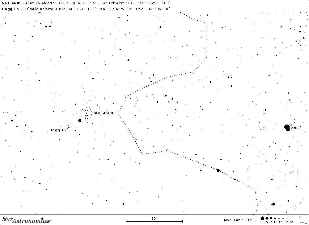 Se trata de Hogg 15, un joven y débil cúmulo estelar abierto, principalmente por su pequeño tamaño aparente de solo 2’ de arco, también por ser pobre en estrellas, unas 15 y, sobre todo por la gran absorción en la zona debida, como hemos visto, al Saco de Carbón, que termina enrojeciéndolo. Su magnitud es 10,3 y su clasificación II 1 p. Aparece compartiendo el mismo campo visual con NGC 4609, del cual se halla a unos 11’ al este-sudeste, con la estrella BZ Crucis en medio. Volviendo a esta interesante estrella, de tono visual amarillento-pálido, ésta es clase B2pe y, está situada a unos 983 años de nuestro Astro Rey. Hogg 15 es un objeto difícil, para aperturas mayores de 10" bajo un cielo rural; apreciándose, con aumentos intermedios a altos, de forma triangular, con cuatro estrellas de 11ª a 12ª mag. y, otras tantas de magnitudes hasta la 15ª. Con aperturas mayores de 12" se observa un poco de condensación central.