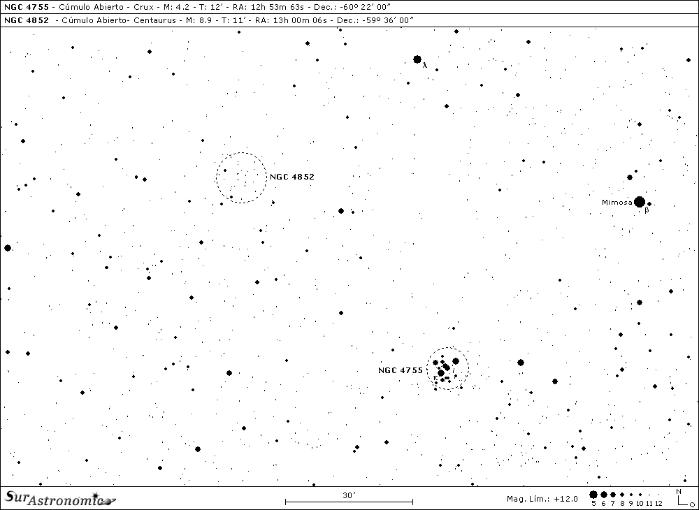 Nuestro punto de partida será el conocido y hermoso cúmulo estelar abierto o galáctico NGC 4755, hallado sobre una rica y bella zona estelar, a menos de un grado al sudeste de la estrella binaria y variable, de mag. 1,3, beta (β) Crucis, Mimosa o Becrux, haciendo muy fácil su localización. Fue catalogado por Bayer, en 1603, como estrella individual y, descripto como "la estrella nebulosa kappa". En el año 1752, el Abad y astrónomo rumano-francés Nicolás Louis de Lacaille o Nicolai-Ludovici De La Caille, descubre este objeto como agrupación estelar, con un telescopio refractor de media pulgada, desde Sudáfrica; incluyéndolo como uno de los 42 objetos de su catálogo de 1755, Sur les étoiles nébuleuses du ciel austral, en las Memorias de la Real Academia de las Ciencias de Paris, Francia. En el año 1827, James Dunlop, hace el primer estudio detallado, separando cómodamente sus estrellas y, John Herschel, tres años después, en 1830, debido al variado brillo de sus estrellas y al efecto de colores provocado en gran medida, por el contraste de su anaranjada estrella central, comenzó a llamarlo como lo conocemos actualmente: Cofre o Caja de Joyas o, Joyero. Además otra muy usada denominación para este bello objeto es: Cúmulo de kappa Crucis. Posee mag. 4,2, diámetro aparente 12’, su clasificación es I 3 r y, se encuentra a unos 6700 años luz de nosotros. Visible con prismáticos de 7x50 desde la ciudad y, tenuemente a simple vista desde un sitio rural, como una estrella algo difusa de 4ª magnitud; ya con pequeñas aperturas, se nos presenta brillante y muy interesante, con unas 7 u 8 brillantes y luminosas estrellas formando un dominante asterismo de forma triangular, como una letra "A" de unos 3’x4,5’; siendo un atractivo objeto para compartir en familia.