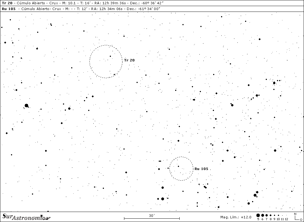 Desde aquí, nos desplazamos 1,2º al sudeste para encontrar nuestro siguiente objetivo, Ru 105. Ubicado también, a unos 2º al nornordeste de alfa (α) Crucis, Acrux, es un cúmulo abierto ingresado por el astrónomo alemán Gero Ruprecht. Ocupa un diámetro aparente de 12’, su clasificación es II 2 p y contiene, alrededor de 30 estrellas débiles, con magnitudes a partir de la 12ª. Carece de una densificación central clara y no es fácil de distinguir ante el rico campo estelar, observándose, a baja potencia con un telescopio Schmidt-Cassegrain de 11", unas cincuenta estrellas en el área, no todas del objeto, como la estrella azulada de 10ª magnitud, GSC 08988-00096, a menos de 2’ al noreste del centro del cúmulo. Se observan en el área, líneas curvadas y grupitos estelares muy interesantes, un bonito asterismo con unas 7 estrellas de magnitudes 11ª a 13ª, a unos 2’ al sur del centro y, una bonita estrella anaranjada de 10ª mag., cerca del centro. Un objeto para aperturas mayores de 8".