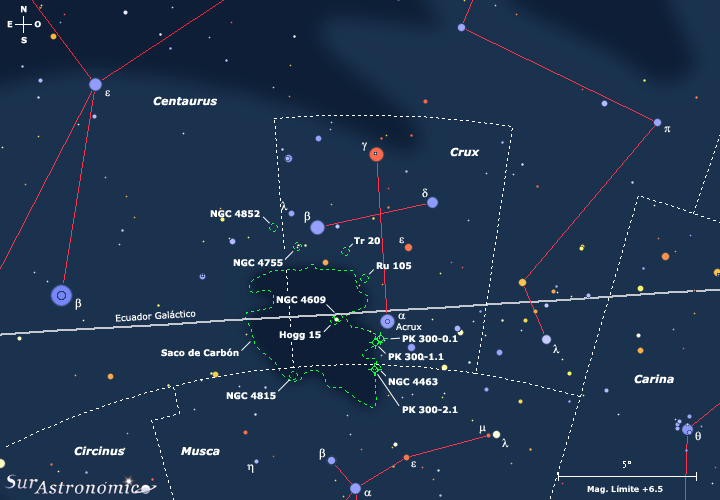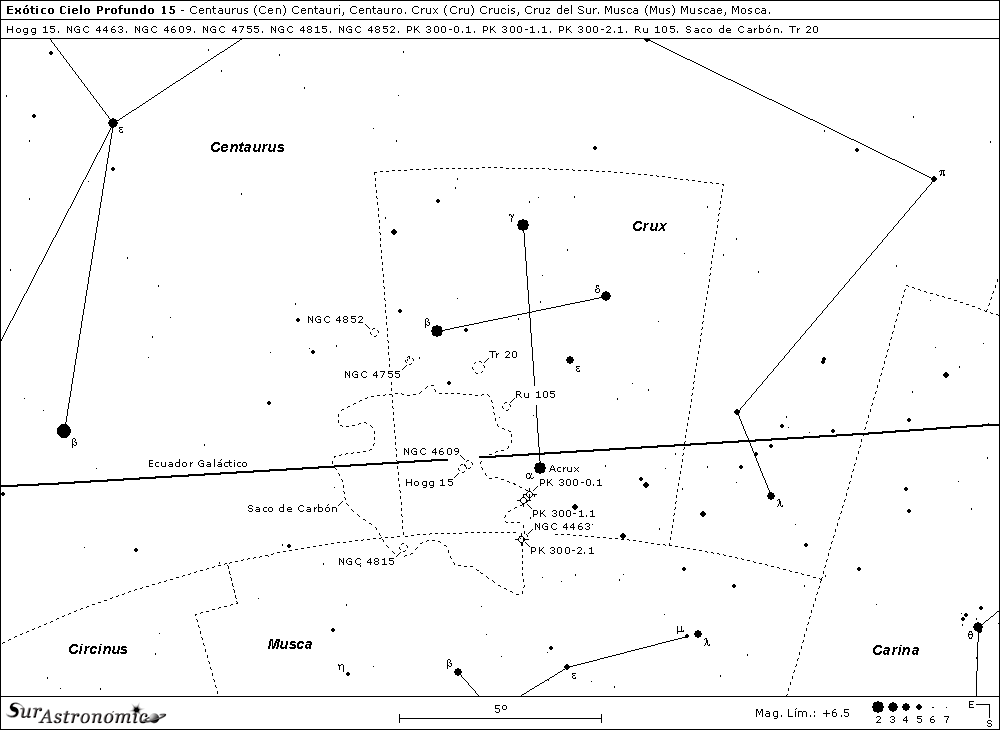 La Cruz del Sur o Crux, la más pequeña de las 88 constelaciones que forman el firmamento, posee varias joyas nocturnas y, en esta ocasión estudiaremos algunas de ellas, más otras en Centaurus y Musca. Vamos a rodear e incursionar dentro de la afamada nebulosa oscura bautizada Saco de Carbón, observando, además de ella, variados cúmulos estelares y, unas pocas y dificultosas nebulosas planetarias. Estos objetos fueron elegidos entre muchos más de este tipo en el área y, esperamos les agraden.