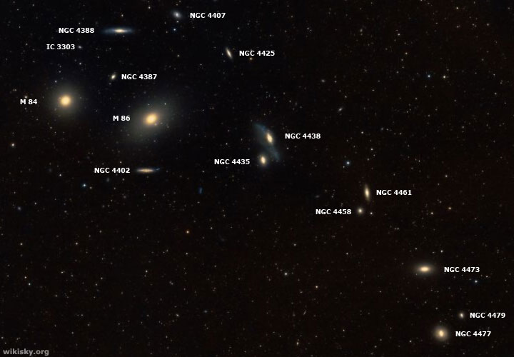 Continuando con el tour, nos trasladamos desde NGC 4438 unos 21’ en dirección noreste, para llegar a NGC 4458 y NGC 4461. Dos galaxias, también descubiertas por W. Herschel en 1784 y aparentemente cercanas, pero que no constituyen un sistema físico real, aunque visualmente se hallan muy juntas, distanciadas por solo 3,7’ de arco. La más destacada es NGC 4461, con magnitud 11,2, mag. fotográfica 12,2 y brillo superficial 12,8. Tamaño aparente 3,5’x1,4’, ángulo de posición de 9º y velocidad radial heliocéntrica calculada de 1931 Km/s. Se trata de una galaxia espiral-lenticular con barra y brazos externos cerrados, clasificada SB(s)0+:.