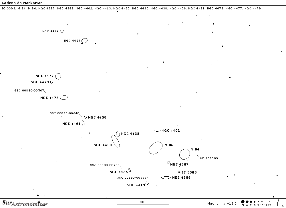 Con el tiempo, este grupo, fue bautizado como La Cadena de Markarian, y se convirtió en un atractivo objetivo para muchos astrónomos amateurs y, es por ello que lo elegimos. De estas galaxias, dos integran el célebre catálogo de Charles Messier, con los números 84 y 86 y, las 6 restantes, el New General Catalogue of Nebulae and Clusters of Stars, o NGC, de J. L. Dreyer, con los números 4435, 4438, 4458, 4461, 4473 y 4477.