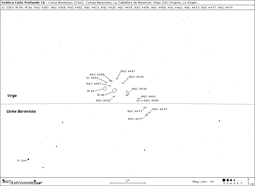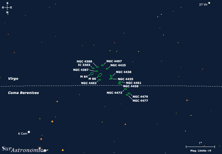Nuestro primer objetivo será la galaxia elíptica M 84, ubicada en el extremo oeste de la cadena. Para hallarla, comenzaremos por posicionarnos a mitad de camino entre las estrellas beta (β) Leonis, Denebola, blanca y variable, de mag. 2,1 y, Epsilon (ε) Virginis, gigante amarilla de mag. 2,9, Vindemiatrix. Luego, con unos prismáticos de 10x50, encontraremos hacia el noroeste del campo, en Coma Berenices, la estrella blanca de mag. 5,1, SAO 100012 ó 6 Com., esta estrella se halla a 6,5º al este de Denebola. Desde 6 Com. Buscaremos, a 1,4º al sudeste, a la estrella anaranjada de 7ª magnitud BU 27 Com., doble cuyos componentes poseen mag. 7,1 y 10,5, sep. 3,6", A. P. 110º. Finalmente desde esta estrella, volvemos a repetir la última distancia, siguiendo esa línea al sudeste, y a 1,5º detectaremos la galaxia.