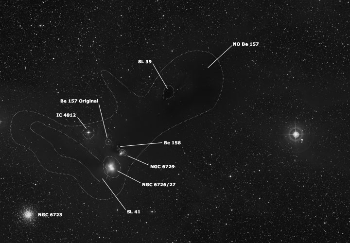 NO Be 157 está situada a aproximadamente 460 años luz de nosotros y, el área más acentuada, ocupa en el cielo una superficie angular de 55'x 18'. La parte más densa del gas y polvo cósmico tiene un diámetro real de unos 8 años luz y, se ubica hacia el sudeste de las nebulosidades de reflexión NGC 6726/7 y 6729, extendiéndose linealmente en esa dirección. Allí es notable el vacío estelar, observando una oscuridad total, con algunas áreas opacas de tono amarronado, realmente interesantes y bellas. A unos 12'al este-sudeste de IC 4812, encontramos una estrella variable de 10ª mag., catalogada GSC 07421-00493; al este de ella, parte un brazo como densa extensión oscura de NO Be 157, que corre de noreste a sudoeste, por unos 15'aproximadamente y, con un ancho irregular de unos 6'. También veremos otros brazos oscuros, a unos 12' al sudeste del anterior, catalogado SL 39 y, otro del lado opuesto de la franja principal de NO Be 157.
