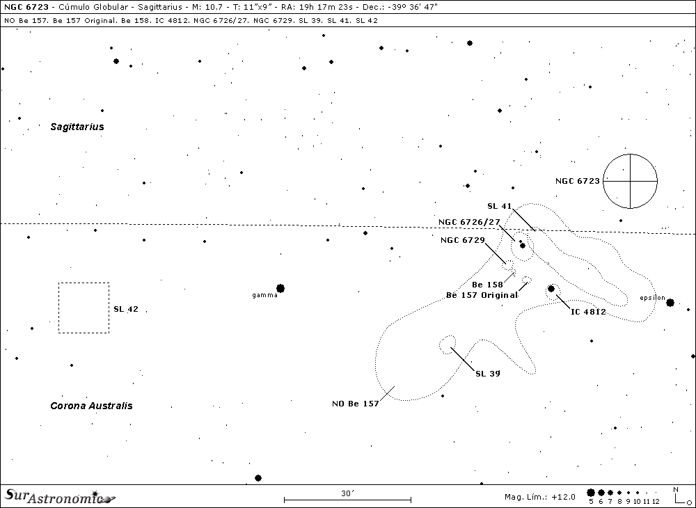 Nuestro primer objetivo es NGC 6723, situado en la constelación de Sagittarius, sobre el borde con Corona Australis, a ½º al nornordeste de la estrella amarilla, epsilon (ε) Coronae Australis. Este antiguo cúmulo globular, cercano al centro de la Vía Láctea, fue descubierto el 3 de junio de 1826, por el gran astrónomo escocés James Dunlop (1793-1848), utilizando un telescopio reflector de 9"con espejo metálico de espéculo, durante su estadía en Parramatta, Nueva Gales del Sur, Australia.