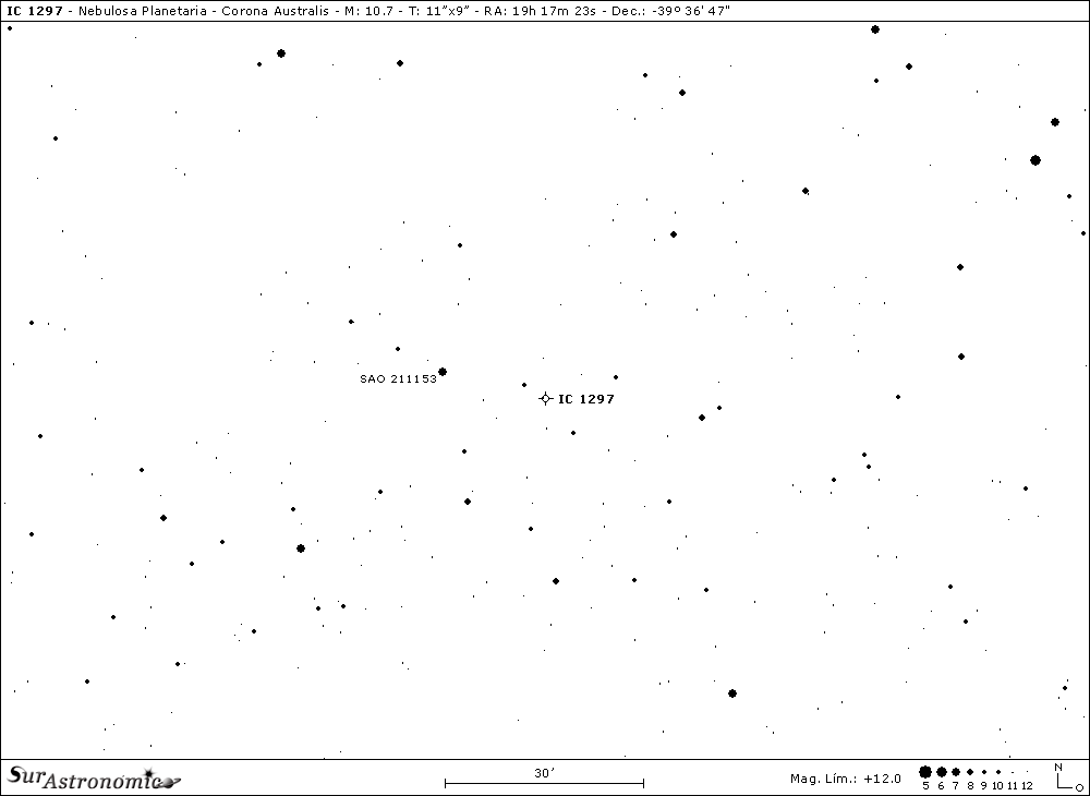 El último objeto a estudiar es IC 1297, una nebulosa planetaria anular, con mag. 10,7, mag. fot. 10,6 y brillo sup. 5,8. Para hallarla, nos movemos desde alfa (α) CrA, casi 1,5º al sur y apenas al este, hasta la estrella anaranjada de mag. 4,1, beta (β) Coronae Australis y, desde ésta, otra distancia igual al este y un poco al sur, hasta llegar a IC 1297. Ya ubicados sobre un atractivo campo estelar, casi sobre el borde este de CrA que limita, nuevamente, con la constelación de Sagittarius, observaremos esta nebulosa, la cual se halla a una discutida distancia del Sistema Solar de 8000 años luz y, su velocidad radial fue estimada en 19 km/s. Sus dimensiones aparentes son 2"/11"x 9"de arco y, fue descubierta, en el año 1894, por la astrónoma escocesa Williamina P. S. Fleming, al revisar placas fotográficas en el Observatorio de la Universidad de Harvard, Cambridge, Massachusetts, Estados Unidos.