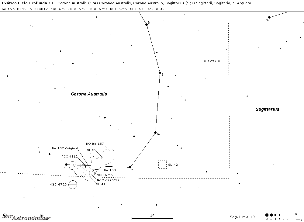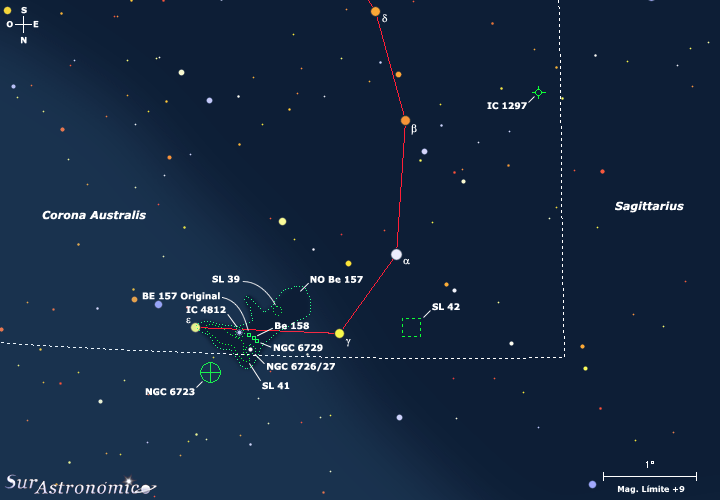 El área que principalmente exploraremos, abarca aproximadamente 1º de extensión y, en ella observaremos nebulosidades oscuras y nebulosidades brillantes asociadas, con variadas condensaciones. También, conjuntamente el ajeno cúmulo globular NGC 6723, en Sgr. Esta zona ésta ubicada sobre el límite noreste de la constelación de CrA, centrada a aproximadamente 40'al este-noreste de al estrella amarillenta, variable eclipsante de mag. 4,7/4,9, epsilon (ε) Coronae Australis, la cual se encuentra a unos 98 años luz del Sol.
