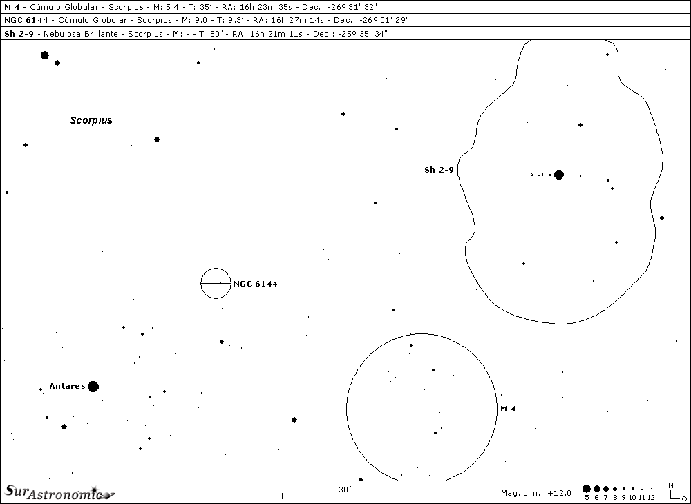 Nuestra segunda parada, a solo 38' al noroeste de Antares, será un oscurecido cúmulo globular de mag. 9, denominado NGC 6144. Tiene un diámetro angular, estimado fotográficamente, de 9,3' , brillo sup. 16,5 y, su componente más brillante es de 13ª mag. Fue descubierto, y resuelto en estrellas, por W. Herschel (1738-1822), durante la noche del 22 de mayo de 1784, utilizando el reflector de 18,7" con espejo metálico de espéculo. Se trata de un cúmulo de baja concentración, clase XI, que está situado a 27700 años luz del Sol, por detrás de las zonas nebulares que envuelven a Antares y a rho (ρ) Ophiuchi, que lo opacan significativamente.