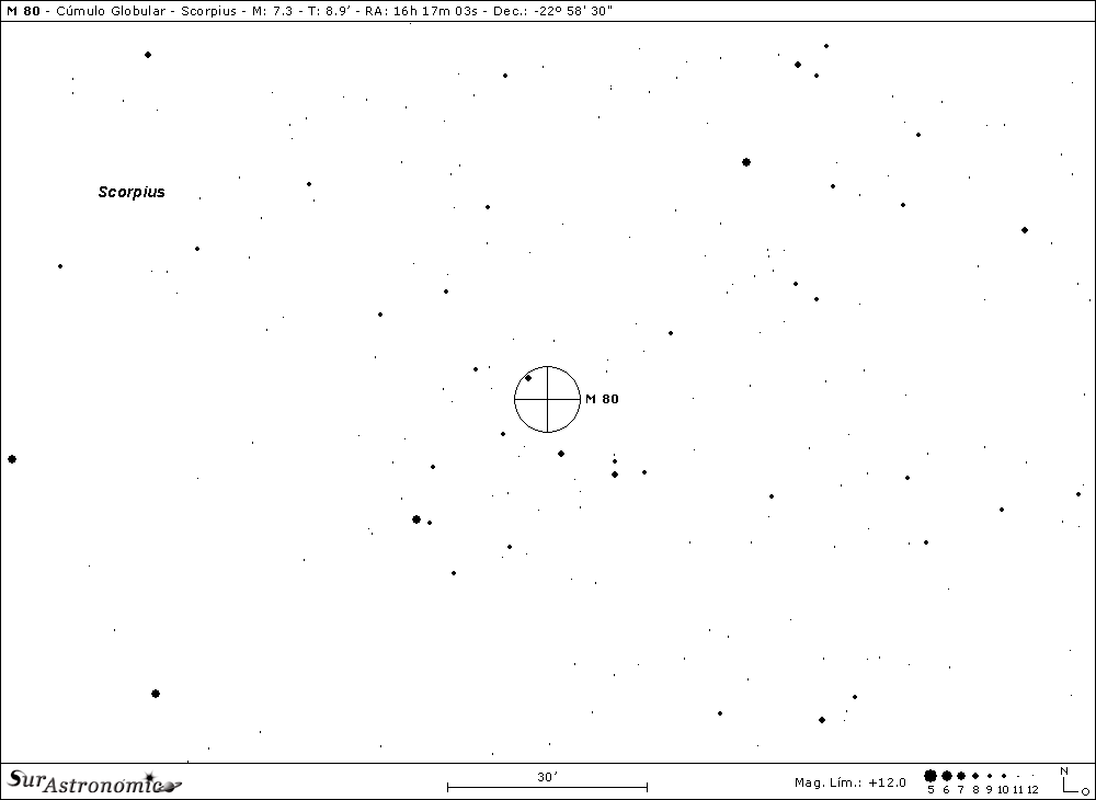 En un SC de 11" a baja potencia, se nota como opaca al cúmulo la zona gaseosa que rodea a Antares. A más de 300x, se resuelve una quincena de delicadas estrellas sobre un cuerpo ligeramente oval e irregular, de 4'.