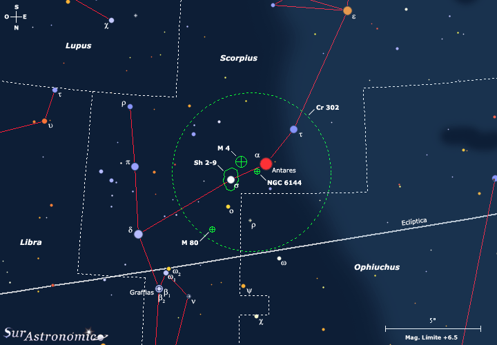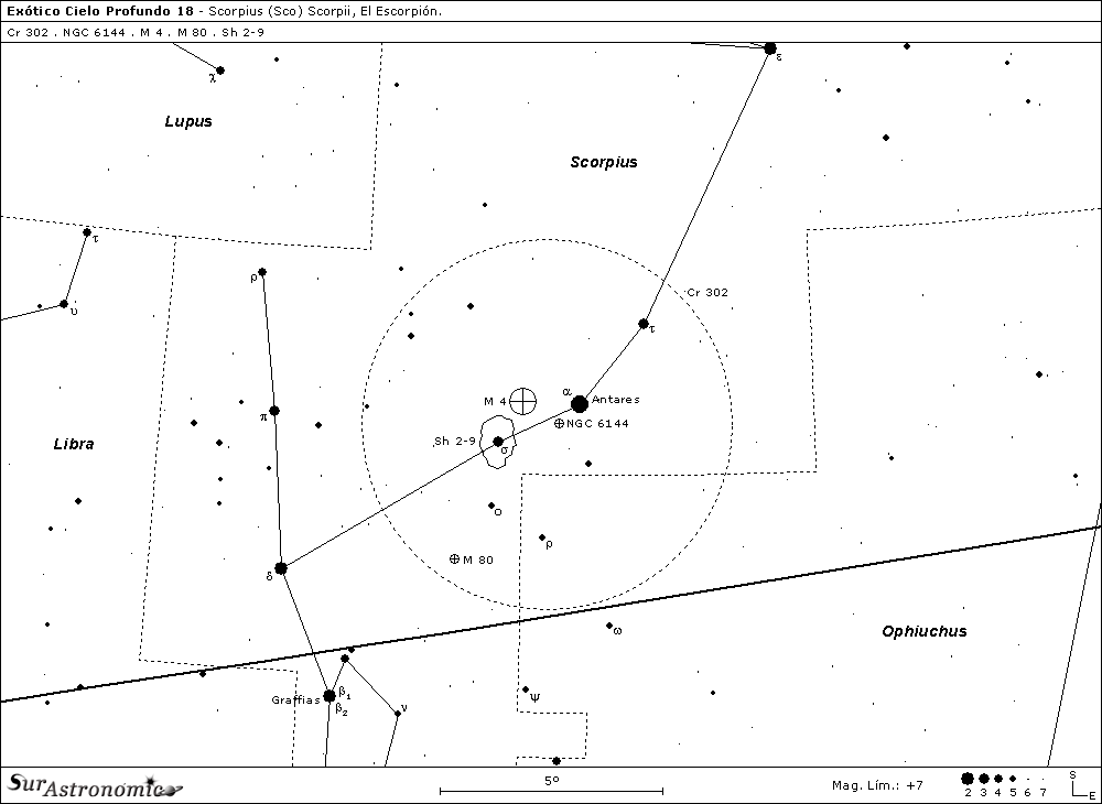 Inicialmente, para esta propuesta habíamos pensado en incluir varios objetos de Ophiuchus y Scorpius, centrando la zona a estudiar alrededor de las sugestivas estrellas alfa (α) Scorpii y rho (ρ) Ophiuchi; pero como esta interesante y atractiva región, compuesta por cúmulos, nebulosidades brillantes y oscuras, es tan amplia para describir, optamos por separar en dos partes la entrega. De esta división quedó como primera propuesta varios de los objetivos situados en la constelación de Scorpius, tres cúmulos globulares, dos nebulosas brillantes y el Cúmulo en Movimiento de Antares. El sector seleccionado ocupa unos 7º cuadrados y, el punto de partida para nuestro periplo nocturno será nada menos que Antares.