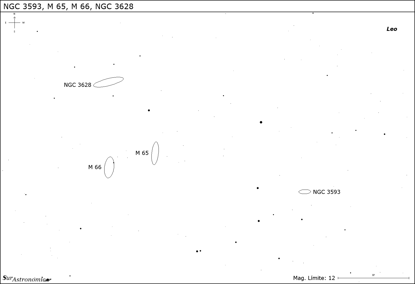 Con variadas combinaciones de instrumental (tipo de telescopio, apertura y ocular), será fácil lograr un mínimo campo visual (FOV) de 50’que nos permitirá apreciar las tres galaxias al mismo tiempo, proporcionándonos una vista exquisita e inolvidable. Ya con esa fuerte panorámica en el ocular, observando desde un sitio oscuro, tendremos el premio de la noche. En el mismo campo veremos a M 65 y M 66 prácticamente con la misma orientación, casi norte-sur y, a NGC 3628 casi perpendicular a ellas, con orientación del eje mayor de este-sudeste a oeste-noroeste. Además, estará presente en el campo la estrella amarillenta de mag. 7,1, SAO 99552 ó HD 98388. La galaxia más brillante será M 66 y, NGC 3628 la más débil pero más grande.