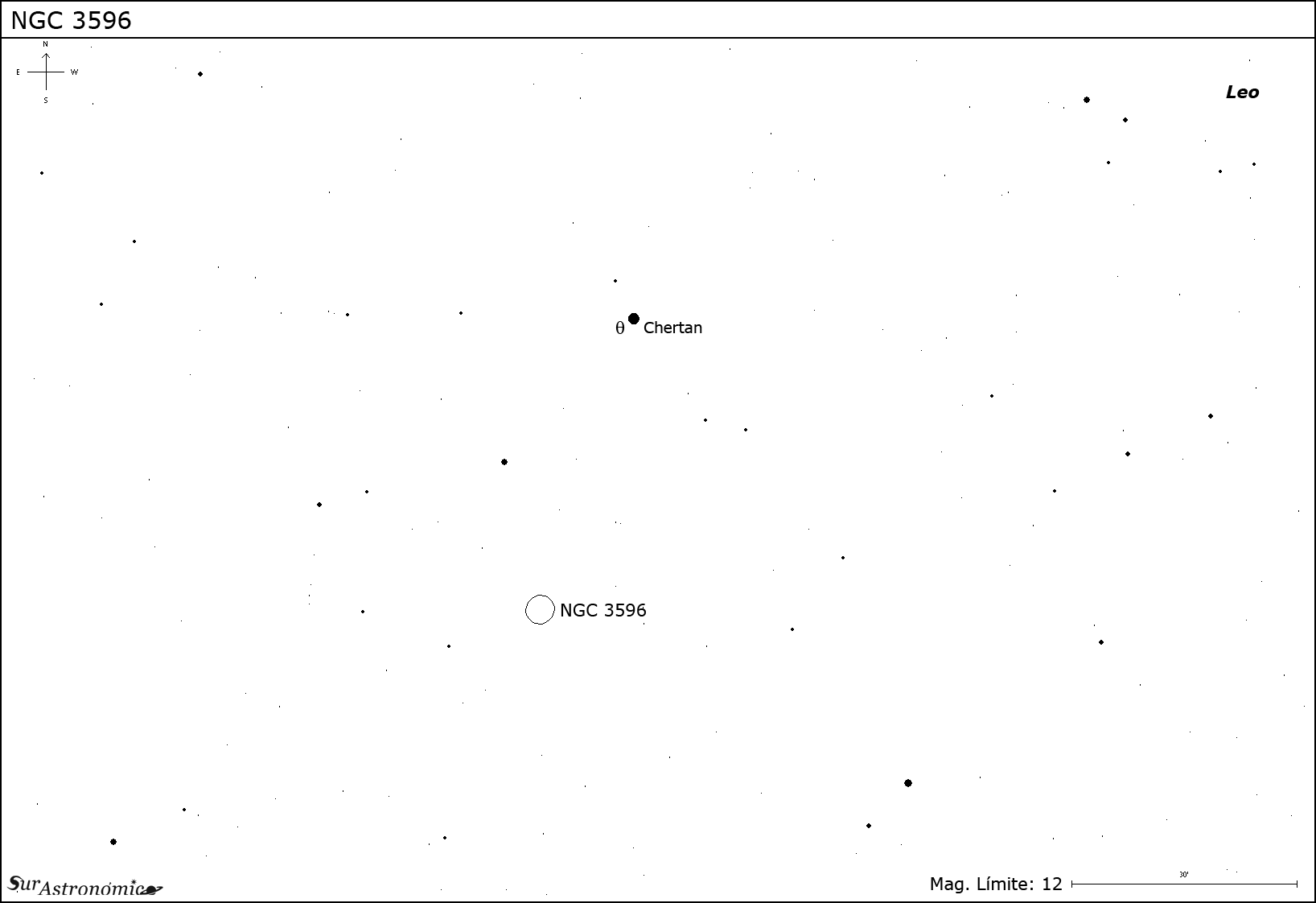 A continuación, volveremos al noroeste dando un gran salto de casi 7º hasta la estrella theta (θ) Leonis, Chertan, para desde allí localizar nuestra última galaxia, NGC 3596. Es una galaxia espiral mixta o intermedia, con dos brazos principales amplios, clase SAB(rs)c. Posee una intensa actividad estelar por todo el disco, en grandes zona HII donde está naciendo gran cantidad de estrellas.