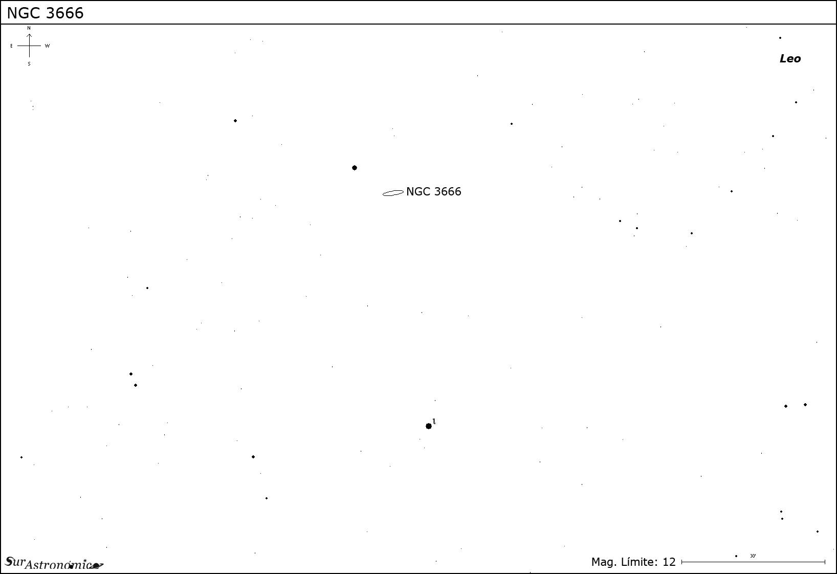 Dejamos NGC 3593 y seguimos camino al sudeste, hacia NGC 3666; una galaxia espiral situada a unos 56 millones de años luz. Para aproximarnos, primero nos posicionaremos en la estrella iota (ι) Leonis y luego, nos trasladamos 50’de arco prácticamente al norte hasta llegar a la galaxia. Para facilitar su ubicación, poseemos la suerte de tener una estrella brillante a solo 10’al este-noreste del centro de la galaxia. Esta estrella anaranjada, de mag. 5,8, es SAO 99598 ó HD 99196 y, aunque logrará un fino contrate con la galaxia, puede molestarnos con su intenso brillo en la observación.