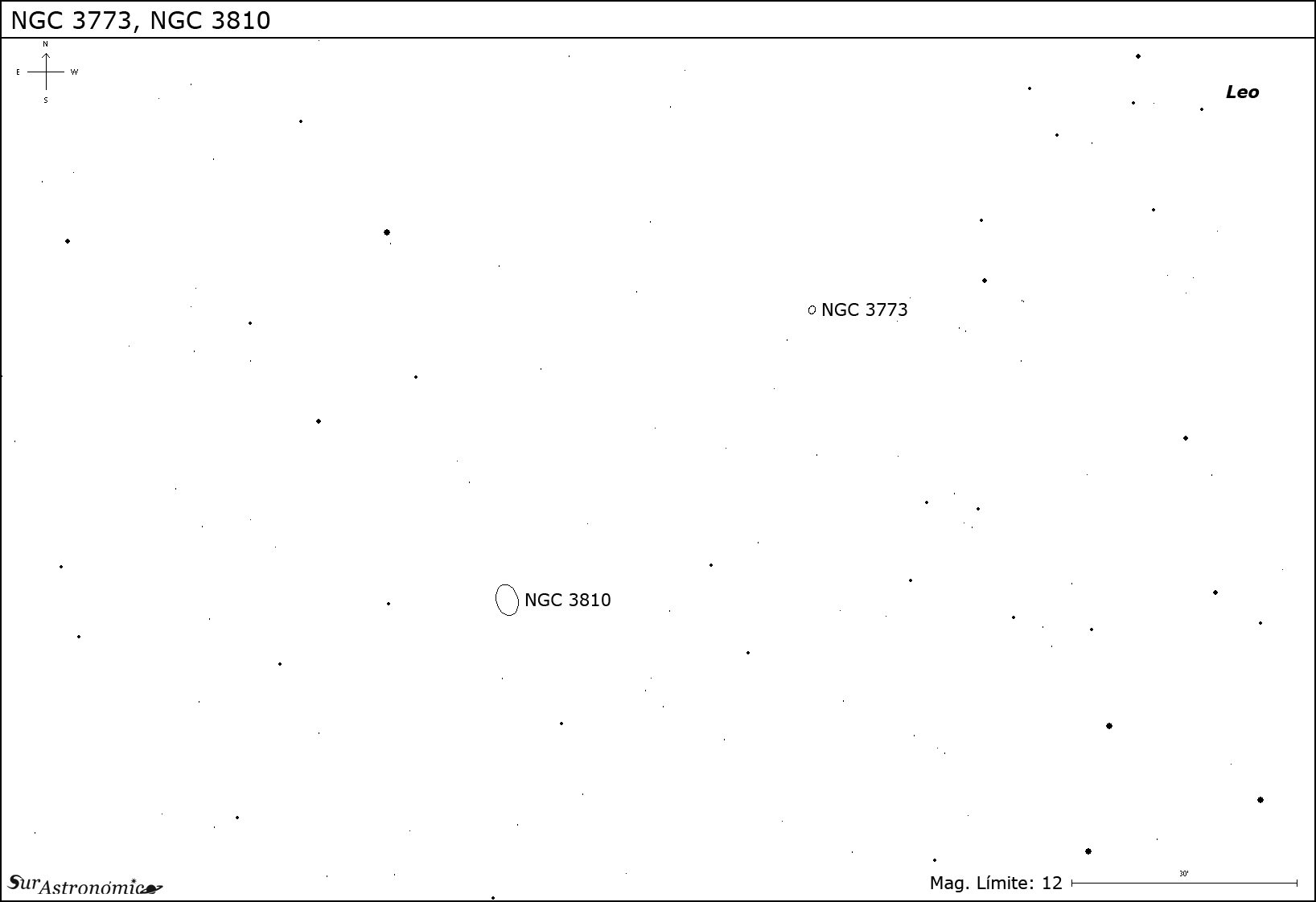 Casi 1º al noroeste de NGC 3810 se halla otra de las difíciles galaxias de la noche, la esquiva NGC 3773. Esta galaxia peculiar, con núcleo activo y, discutida morfología, está clasificada como lenticular SA0:. Puede detectarse con pequeños telescopios, bajo un oscuro cielo, pero hasta con telescopios reflectores de 8”lucirá pobre, muy tenue y apagada, redondeada y pequeña, asegurando su presencia con visión periférica y aumentos intermedios. En un SC 11”a 140 x, aparecerá como un débil y difuso halo ligeramente oval de unos 20”en diámetro, con un minúscula zona central apenas más brillante. Recién con grandes reflectores comenzará a ser más interesante su estudio visual y, en reportes de observación con dobsoniamos de 18”, la describen oval y algo concentrada, con orientación sudeste a noroeste y, núcleo casi estelar; halo pequeño y etéreo. Próximas a la galaxia, sobre todo hacia el oeste, existen varias estrellas de brillo moderado, la más cercana es la amarillenta TYC 860-217-1 ó GSC 00860-00217, de mag. 10,7,ubicada a solo 5,2’al sudeste de la galaxia.
