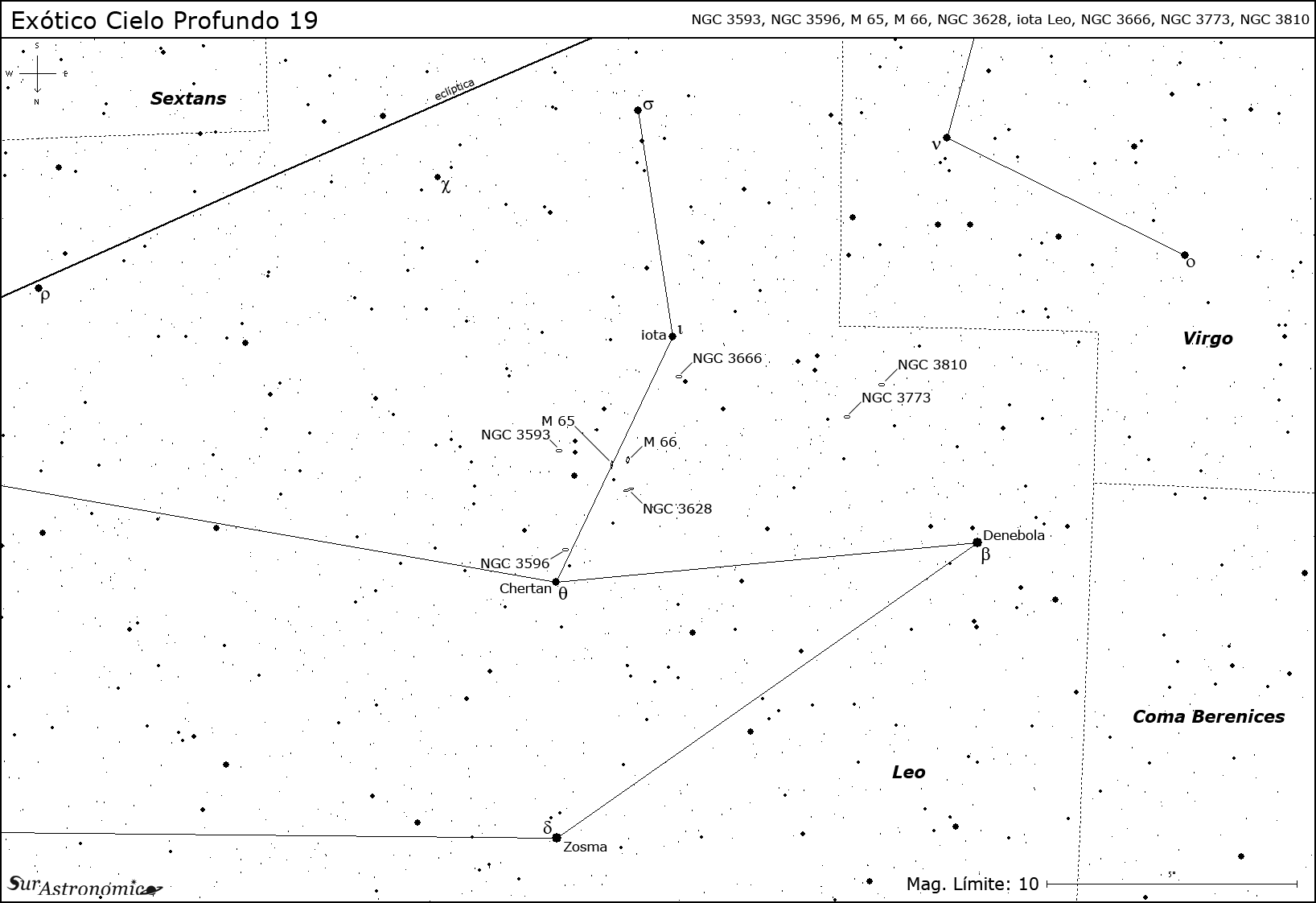 Para esta ocasión dirigiremos nuestra vista hacia el este de dicho quinto asterismo zodiacal, a las patas del león (extremidades traseras), exactamente a la zona que se encuentra en medio de las estrellas theta (θ) Leonis, Chertan, blanco-azulada de mag. 3,3 e, iota (ι) Leonis, amarillenta de 4ª magnitud. En el área se halla el conocido y bello Triplete de Leo, formado por las galaxias M 65, M 66 y NGC 3628 y, allí centraremos nuestro estudio visual. Además visitaremos cinco galaxias más, visualmente cercanas (dentro de un espacio de casi 28º cuadrados), todas del catálogo NGC o, New General Catalogue of Nebulae and Star Clusters, publicado en el año 1888 por el astrónomo de origen danés J. L. E. Dreyer (1852-1926).